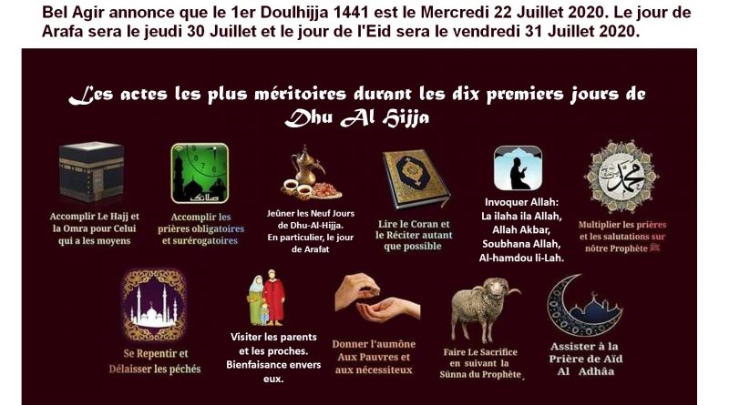 Annonce : Bel Agir vous annonce que le 1er Doulhijja 1441 est le Mercredi 22 Juillet 2020. Le jour de