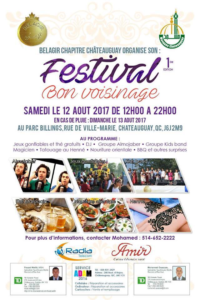 Festival Bon Voisinage Première édition du Festival Bon Voisinage à Châteauguay 10 août 201714 août 2017 Ihssan A. L’association Bel Agir vous invite à sa première édition du Festival Bon Voisinage à Châteauguay, le samedi 15 juillet 2017, au parc Billings rue de VILLE-MARIE, CHÂTEAUGUAY (J6J 2M9). Vous êtes les bienvenus!